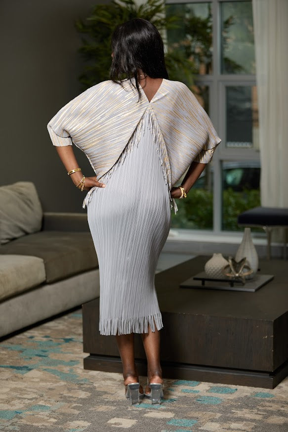 The subtle pleating flows beautifully, adding a sense of timeless grace, while the fringed hemline brings a modern edge to the design. Whether you're attending a garden soirée or a stylish gathering, this dress will make you feel like a living work of art.