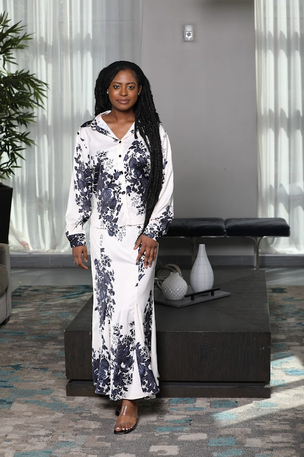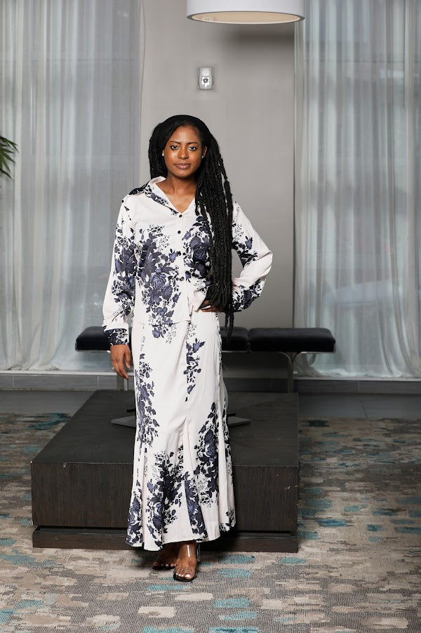 Featuring a sophisticated button-down top with a collared neckline and long sleeves. The delicate floral print adds a timeless charm, while the maxi skirt flows with a sense of grace, perfect for any occasion.