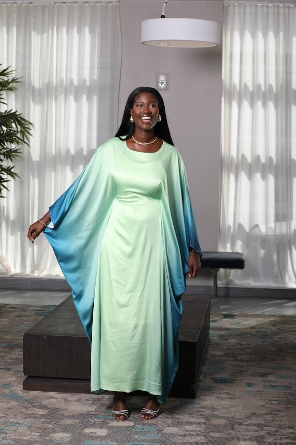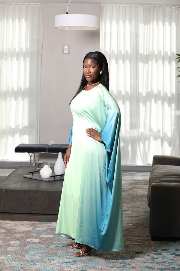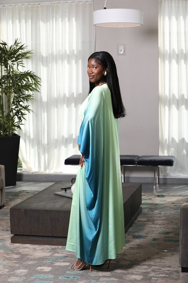 Embrace the flow of elegance with this stunning mint green maxi dress, featuring a classic round neckline and a sleek, minimalist silhouette. The coordinating gradient shawl, draping gracefully over the shoulders, adds an ethereal touch of movement and color contrast from green to blue