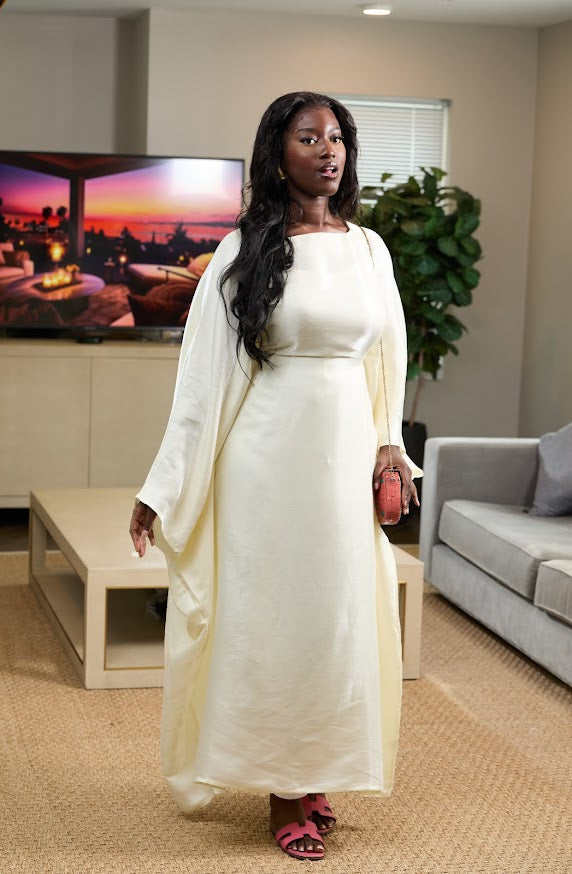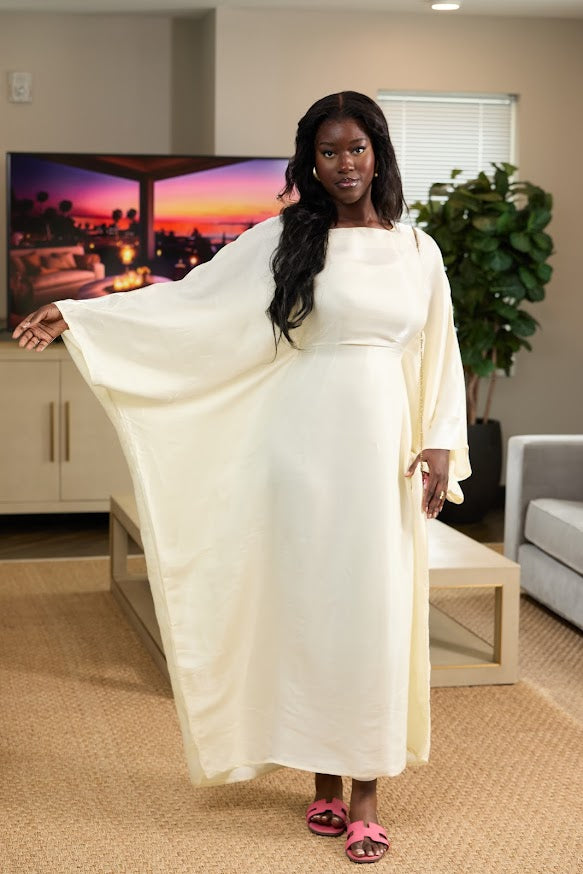 Embrace the flow of elegance with the Ivory Serenity Kaftan, a piece that features a minimalist design with a boat neckline and flowing wide sleeves that drape gracefully.