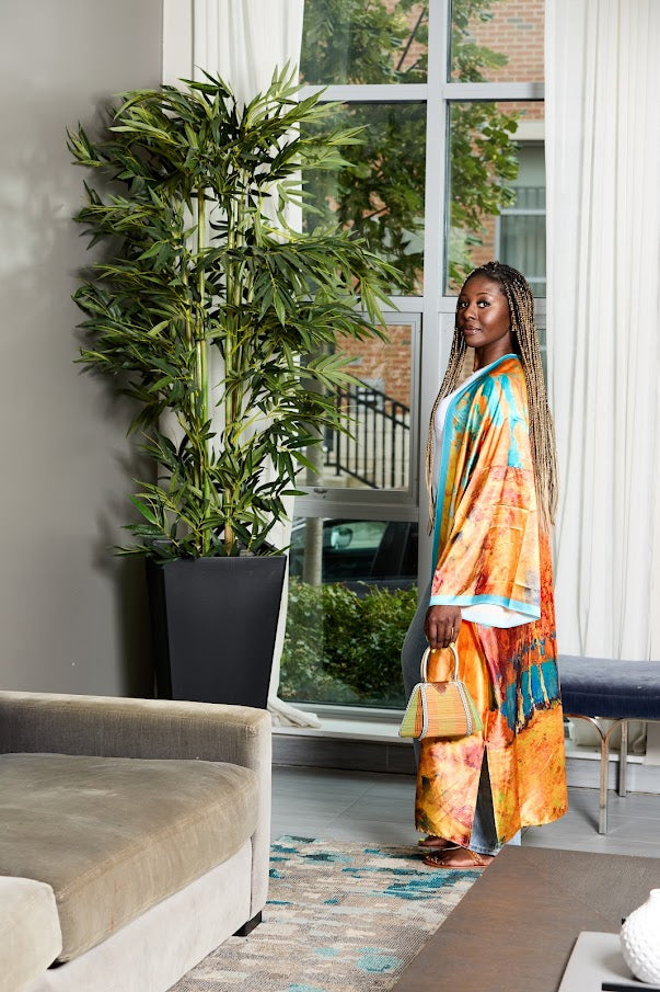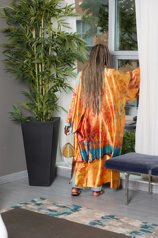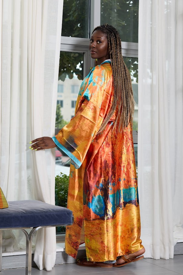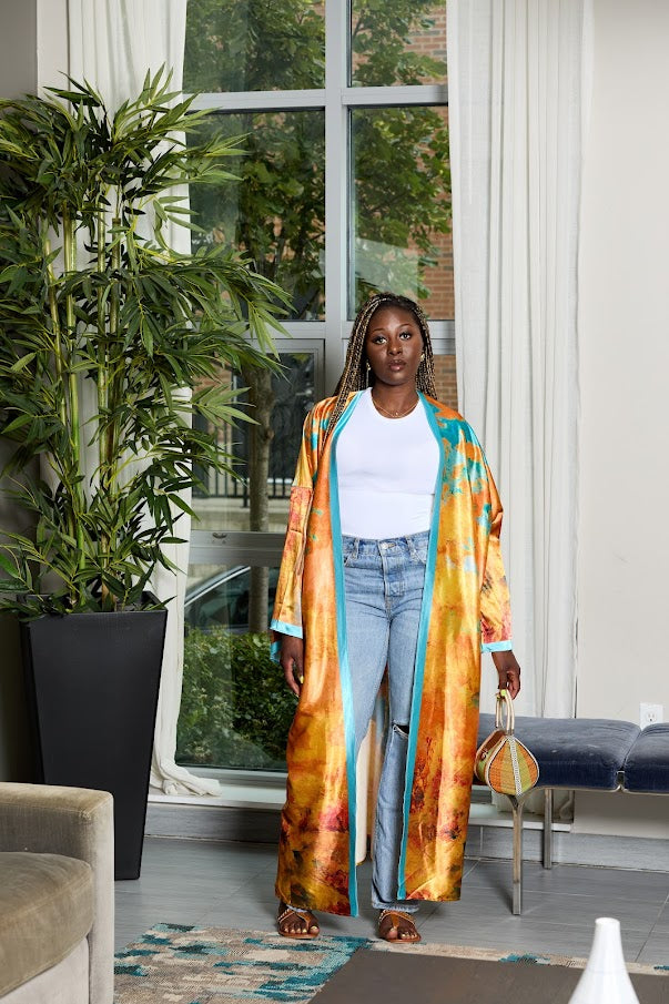 The vibrant, earthy tones of amber and turquoise blend together in a captivating pattern, reminiscent of a breathtaking desert sunset. Whether you're layering it over casual denim or dressing it up for an evening out, this kimono will make you feel like a living work of art.