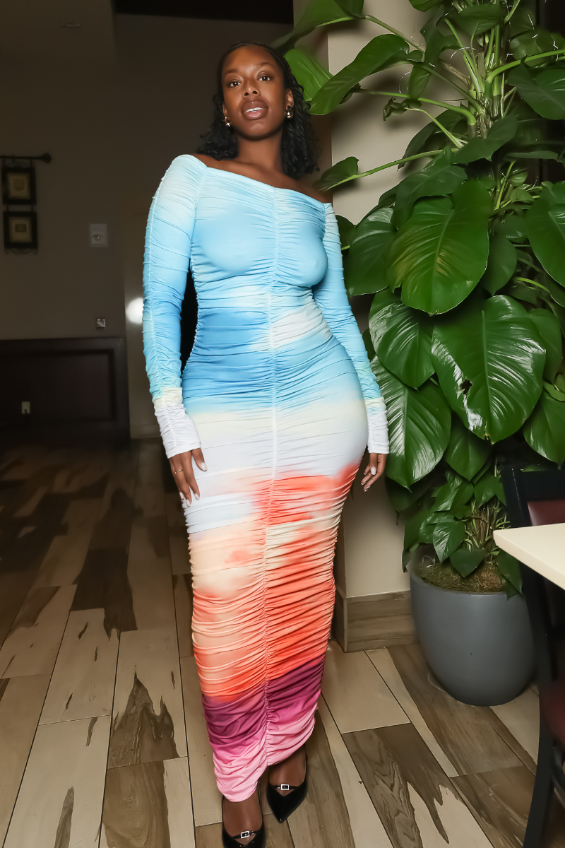 Radiate soft drama in the Sunset Cloud Ombre Ruched Maxi Dress — a body-hugging stunner featuring a dreamy gradient from sky blue to fiery coral and rich plum. The off-shoulder neckline and full-body ruching sculpt the silhouette while adding stretch and elegance. This piece is perfect for cocktail nights or an elevated vacation dinner look.